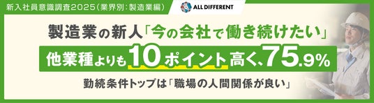 累計20,000社450万人以上の組織開発・人材育成を支援するALL DIFFERENT(オールディファレント)株式会社(所在地:東京都千代田区 代表取締役社長:眞崎大輔)および「人と組織の未来創り(R)」に関する調査・研究を行うラーニングイノベーション総合研究所(R)は3月25日~4月24日の期間で、2025年度入社の新入社員3,933人を対象に「新入社員意識調査」を行いました。本リリースでは、製造業の新入社員の調査結果を公表いたします。