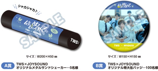 カラオケ店舗から参加する場合は、最新機種「JOYSOUND X1」をはじめとした対象機種を導入のカラオケ店舗で、スマートフォンをカラオケのリモコンとして利用できるアプリ「キョクナビJOYSOUND」(無料)を使って、「はじめまして」をはじめとする課題曲を選曲ください。その場でスマートフォンに表示されるスピードくじで、参加者全員にTWS×JOYSOUND オリジナル待ち受け画像(全6種ランダム)をプレゼント!さらにWチャンスとして抽選でTWS×JOYSOUND オリジナルメタルサンドシェーカーを5名様に、TWS×JOYSOUND オリジナル特大缶バッジを100名様にプレゼントします。なお、スピードくじには毎日、1曲につき1回チャレンジでき、キャンペーン期間中は何度でも、ご応募いただけます。