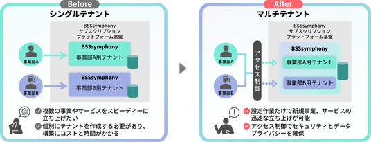 今回、マルチテナント対応が可能になったことで、事業管理者はシステムを再構築することなく、マスタ設定のみで、新たな事業やサービスの顧客管理、契約管理、課金管理をすぐに開始できるようになりました。さらに、事業単位で関係者のアクセス権限を制御できるため、データプライバシーにも対応します。