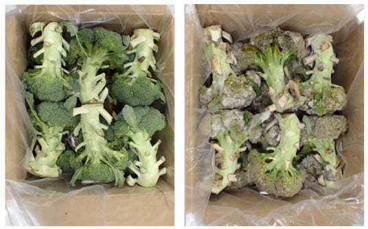 段ボールに詰めたブロッコリーを、モイスト・クールシステムまたは一般冷蔵庫で、78日間保管し、その後、室温で1日置いた際の比較(※ベルグリーンワイズのラボ機で試験)。