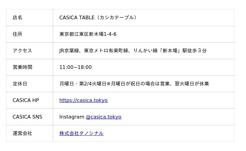 株式会社タノシナル(本社:東京都江東区、代表取締役:福島ツトム)は、2025年7月9日(水)新木場駅より徒歩3分のコンプレックス・スペース「CASICA」内のレストランを「CASICA TABLE」としてリニューアルオープンいたします。