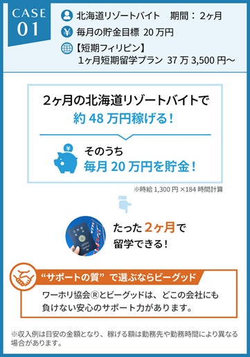 リゾートバイトに特化した求人サイト「リゾートバイト.net」(https://resortbaito.net/ )を運営するビーグッド株式会社(所在地:東京都中央区、代表者:福島 崇司、以下当社)は、この度、一般社団法人日本ワーキング・ホリデー協会と協同で海外留学やワーホリを支援する新サービス「貯金0円からでもOK!留学・ワーホリ&リゾートバイト」を開始しました。