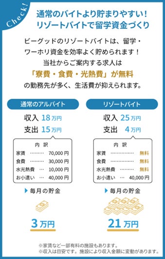 当社がご案内するリゾートバイトの求人は、「寮費・食費・光熱費」が無料の勤務先が多く、生活費が抑えられることで、海外留学・ワーホリのための資金を効率的に貯めることができます。