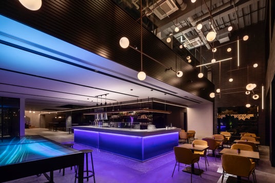 イベント会場は、エントランスを入ってすぐ、数々の照明やサイネージが光る1階・2階のラウンジスペース。チェックインのゲストを迎え入れるフロントや、カフェ利用もできる「THE LIVELY BAR」があり、普段は地元の人や観光客で賑わいます。