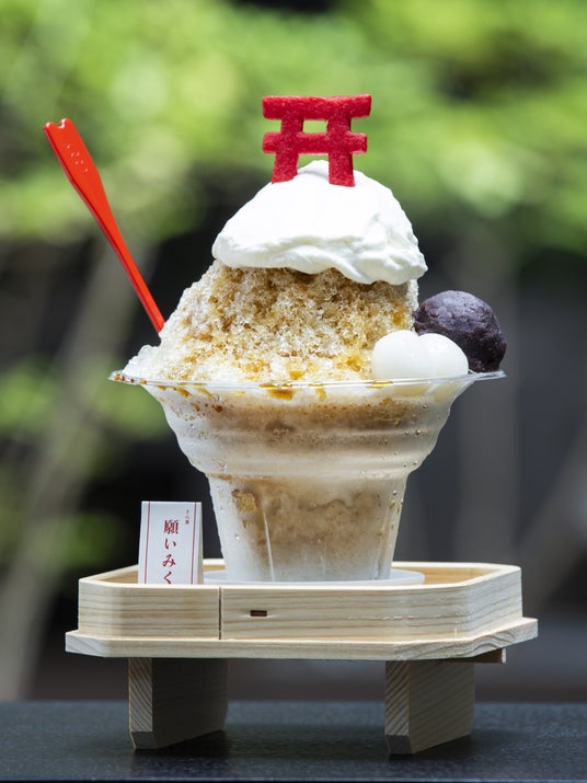 『かみ氷』はまるで願いがそっと広がっていくような、ふわりと軽くて優しい口溶け。ふわふわの氷の上には、エスプーマで出来た当店オリジナルの練乳クリームと鳥居のクッキーをトッピングしました。