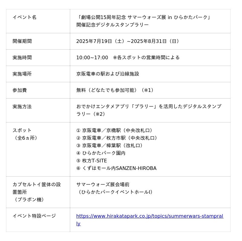 「人流の創出で、地域経済・地方経済を活性化する」をミッションに掲げるジオフラ株式会社(本社:東京都千代田区、代表取締役社長 社長執行役員CEO:尾崎雄一、以下ジオフラ)は、ひらかたパークにて開催される「劇場公開15周年記念 サマーウォーズ展 in ひらかたパーク」にあわせ、京阪沿線でおでかけエンタメアプリ「プラリー」を活用したデジタルスタンプラリーを実施いたします。