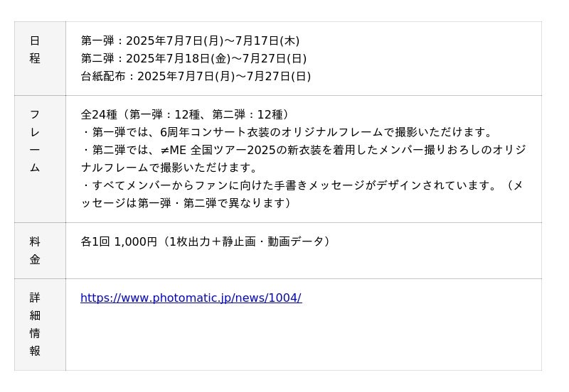 キタムラ・ホールディングス グループのピックハイブ株式会社(本社:東京都新宿区、代表取締役社長兼COO:大迫 由典)が運営するセルフフォトブース「Photomatic」で、2025年7月7日(月)~2025年7月27日(日)まで、全国ツアー開催中の「≠ME」コラボレーションのスペシャルフレームが期間限定で登場します。さらにイベント開催中に、≠MEスペシャルフレームで撮影したPhotomaticを2枚お持ちいただくと、Photomaticを挟める≠MEオリジナル台紙をプレゼントします。メンバーとのリアルな2ショット撮影をお楽しみください!