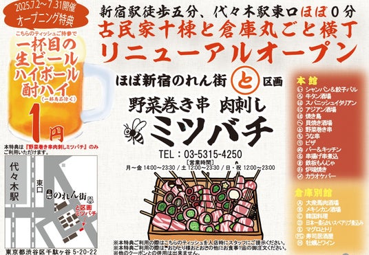 古民家まるごと横丁ほぼ新宿のれん街にて「野菜巻き串 肉刺し ミツバチ」2025年7月2日(水) リニューアルオープン!!