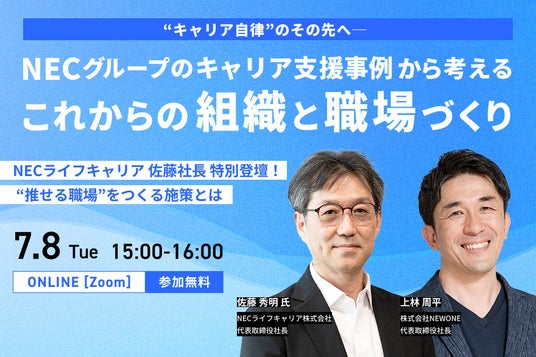 エンゲージメント向上を軸とした組織開発・人材育成コンサルティング支援を通して“推せる職場づくり”を進める株式会社NEWONE(本社:東京都港区 代表取締役:上林 周平、https://new-one.co.jp/ 以下、NEWONE)は、2025年7月8日(火)15時より、NECライフキャリア株式会社 代表取締役社長の佐藤 秀明氏をお招きし、“推せる職場づくり”を目指した社員のキャリア開発に関する施策について、オンラインセミナーを実施いたします。