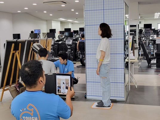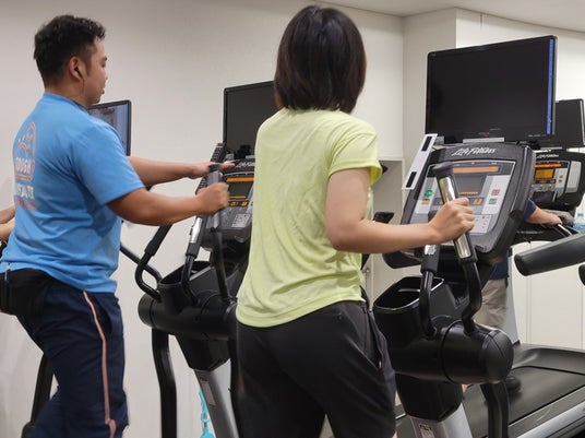 パン教室中、ジムでカラダの測定や軽い運動をするパパママ