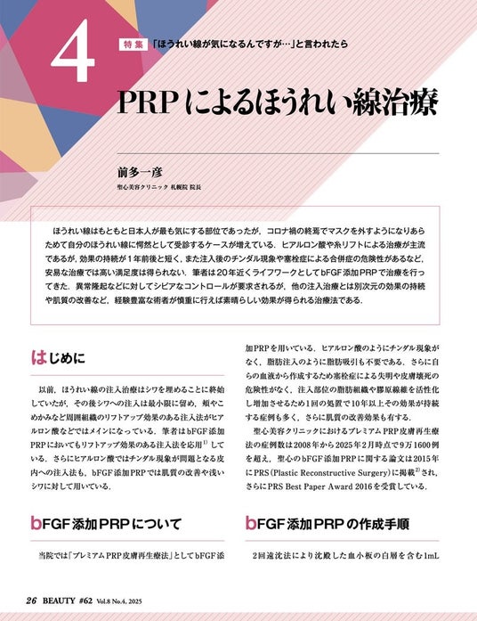 「とことん真面目に、美容医療。」をスローガンに、高品質な美容医療を提供する 聖心美容クリニック( 医療法人社団美翔会 本院所在地:東京都港区六本木 全国11院)の札幌院院長 前多一彦医師が、美容皮膚科の専門誌「美容皮膚医学BEAUTY」にて、『PRPによるほうれい線治療』について執筆しました。