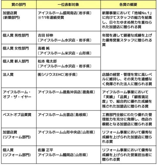 表彰式は、累計上棟数を表彰する「100倶楽部」を皮切りに昨年1年間の取り組みにおいて、高い業績を収められた店舗および個人を表彰する業績表彰が執り行われ、参加した全員でその成果を称え合いました。ベストオブ品質賞はアイフルホーム出雲店が、アイフルホーム・オブ・ザ・イヤーはアイフルホーム徳島沖浜店が受賞。加盟店賞 新築部門は、アイフルホーム盛岡南店が11連覇を達成しました。