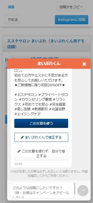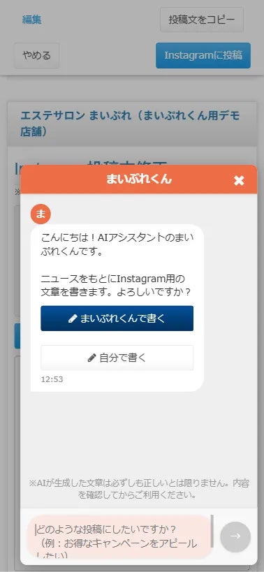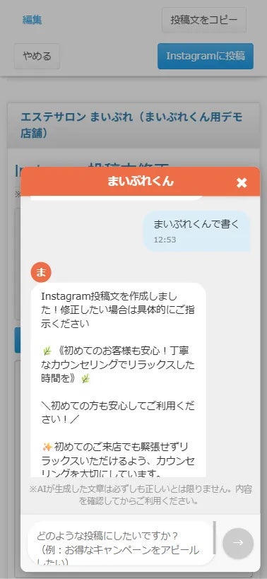 ・過去にInstagramに投稿した文章をまいぷれくんに読み込ませることで、お店のトーンに合わせた文章の作成・修正をすることができる。