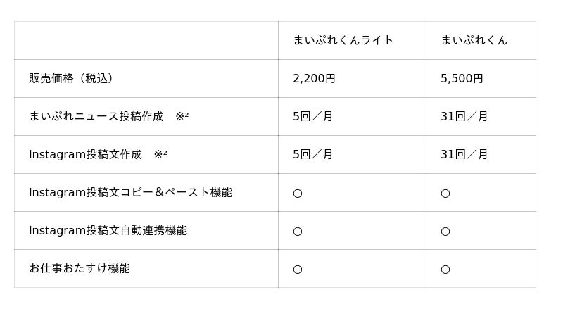 なお、まいぷれくんは、まいぷれの基本プランである「まいぷれニュースプラン(月額7,700円~)※¹」をご契約のお客様に提供するアップグレードプランです。表内の販売価格は、基本プランの月額料金に追加で掛かる金額となります。