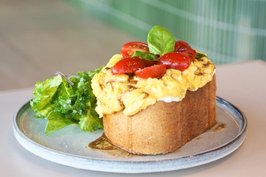 目を奪われるのは、6~7cmもの厚さにカットされた特大カンパーニュ。その上に、ふんわりとろとろのスクランブルエッグをたっぷり重ね、トマトマリネとバルサミコソースで仕上げました。思わず写真を撮りたくなるボリューム感たっぷりのフォルムと圧倒的な存在感。食べごたえがあり、満足度も高い一品です。