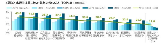 水辺で注意したい・気をつけたいことは、「ごみは持ち帰る」「流れが速い・深い場所には近づかない」が4割台、「立入禁止区域に立ち入らない」「急な増水に注意する、すぐに避難する」が3割台後半。