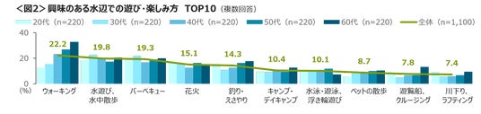 興味のある水辺での遊び・楽しみ方は、「ウォーキング」「水遊び、水中散歩」「バーベキュー」がTOP3。