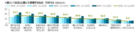 60代は「風や水の音から涼しさを感じられる」「暑い日でも風が心地よい」が高く、「涼しさ」を連想する人が多い。<図1>