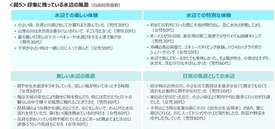 印象に残っている水辺の風景は、水辺での楽しい体験や特別な体験、水辺の美しい風景などの声があげられた。<図5>
