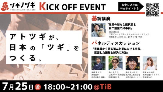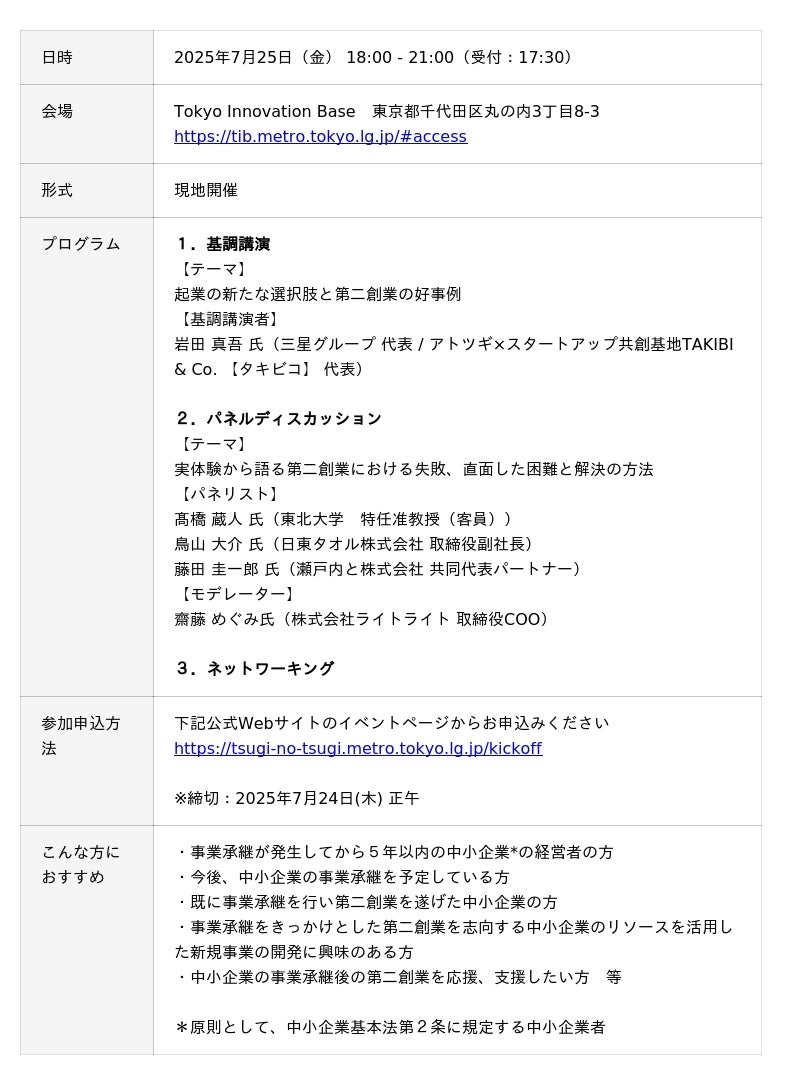 東京都では、事業承継を行った企業が新規事業を創出し「第二創業」を遂げることを支援するため、令和7年度から、「ツギノツギ」プロジェクトを開始します。本事業のキックオフイベントを7月25日(金)18時~、有楽町のTokyo Innovation Baseにて開催しますのでご関心のある方はぜひご参加ください!