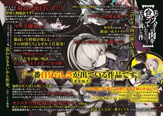 デビューから1年で5作品も刊行されるなど話題の尽きない「駄犬」先生がおくる『モンスターの肉を食っていたら王位に就いた件』など