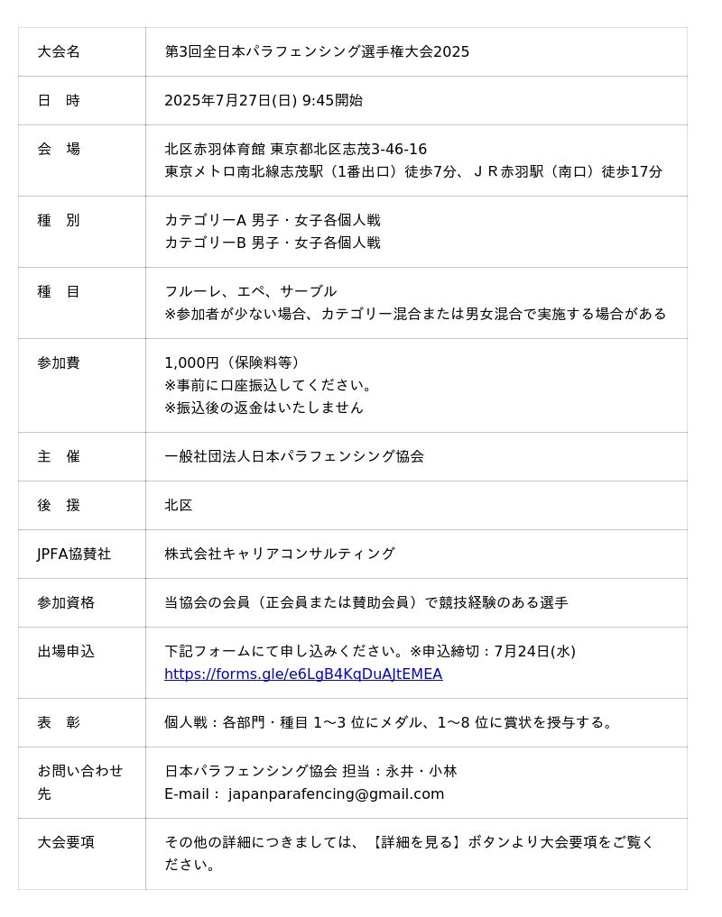 【7/27(日)】第3回全日本パラフェンシング選手権大会を開催いたします!(一般社団法人日本パラフェンシング協会)