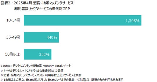 次に、利用者数上位3サービスを合計したターゲットGRPを年代別に見ると、18-34歳で1,508%と最も高く、次いで35-49歳で449%となっていました(図表2)。