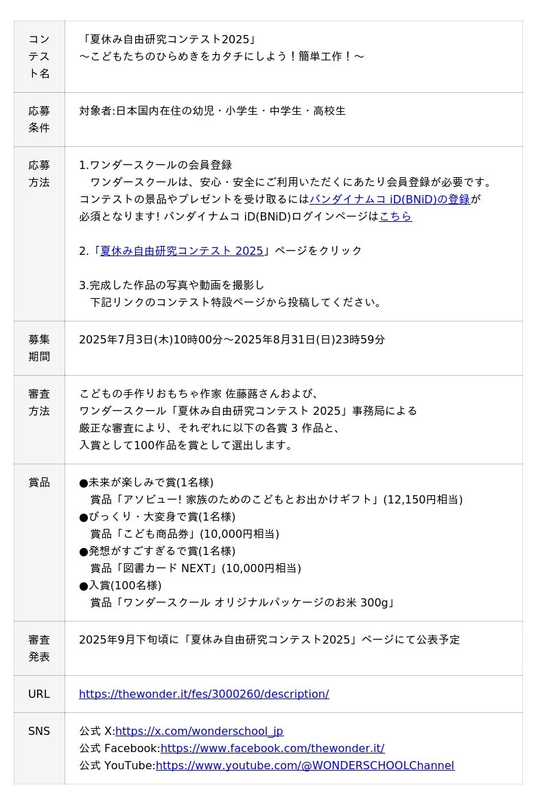 株式会社バンダイ(本社:東京都台東区)は、2015年から「こどもたちの夢中を応援」をコンセプトに、参加型投稿サイト「ワンダースクール」を運営しています。本日2025年7月3日10時より「ワンダースクール」サイトにて、「夏休み自由研究コンテスト 2025」~こどもたちのひらめきをカタチにしよう!簡単工作!~を開催いたします。