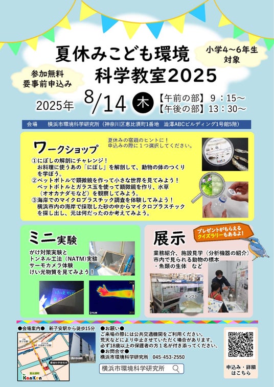 横浜市環境科学研究所は、2025年8月14日(木)に、小学4年生~6年生とその保護者を対象とした「夏休みこども環境科学教室2025」を開催します。研究所の業務にちなんだワークショップや展示を通じて楽しく環境について学べます。ぜひお申込みください!