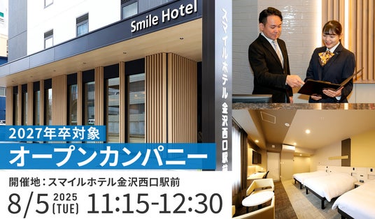 全国でホテル、旅館、グランピング、スキー場、ゴルフ場、飲食事業、保育園などのホスピタリティ事業を展開する株式会社ホスピタリティオペレーションズ(本社:東京都千代田区、代表取締役:田中章生)が運営する『スマイルホテル金沢西口駅前』は、2025年8月5日(火)に、学生を対象とした「オープンカンパニー&キャリアイベント」を初開催いたします。本イベントは、当社として初めての試みであり、新卒入社の若手社員が中心となって企画いたしました。当日は、現在第一線で活躍する新卒入社の先輩社員が登壇し、実際の仕事内容や働く環境、キャリアについて、座談会形式で学生の皆さまと直接交流しながらご紹介いたします。