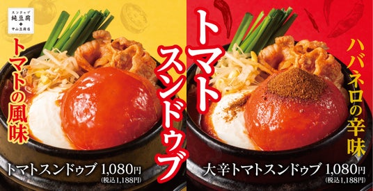 "大豆の横綱"トヨマサリでつくる自家製豆腐と、特製のタテギと野菜をペースト状にしたオリジナルスンドゥブスープを味わうスンドゥブ定食専門店「スンドゥブ 中山豆腐店」にて、湯むきをして昆布出汁に漬け込んだトマトを半玉のせた「トマトスンドゥブ」と、ひとくち頬張れば汗が流れるほど刺激的な辛さの「大辛トマトスンドゥブ」を、2025年7月9日(水)より期間限定で販売開始いたします。