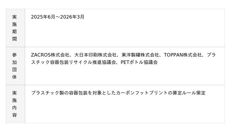 ZACROS株式会社(本社:東京都文京区、代表取締役社長:下田 拓)、大日本印刷株式会社(本社:東京都新宿区、代表取締役社長:北島 義斉、以下 DNP)、東洋製罐株式会社(本社:東京都品川区、代表取締役社長:本多 正憲)、TOPPAN株式会社(本社:東京都文京区、代表取締役社長:大矢 諭)、プラスチック容器包装リサイクル推進協議会(所在地:東京都港区、会長:小山 博敬、プラ推進協)、PETボトル協議会(所在地:東京都中央区、会長:黒澤 和之)の6者は、環境省が行う「製品・サービスのカーボンフットプリントに係るモデル事業」に参画することが決定しました。これにより、プラスチック製の容器包装を対象としたカーボンフットプリント(CFP:Carbon Footprint of Product)の算定ルールの共通化に業界全体で取り組みます。