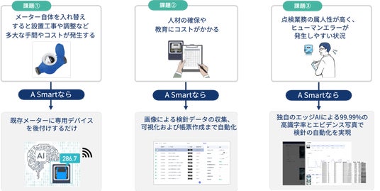 A Smartの強みは「アタッチメント方式」と「エッジAI」という特徴にあります。一般的にメーターをスマート化する場合、既存のメーターそのものを交換する必要があり、これにはデバイスや交換工事などに多くのコストと時間を要します。一方で、A Smartは水道・電気・ガス・針式アナログなど様々な既存のメーターに対してアタッチメント(後付け)形式により数分で簡単に設置でき、工事は不要です。加えて、A SmartはエッジAI技術によって、デバイス側で取得データを処理し、クラウドに送信できるため、通信量を低減し消費電力を削減できます。