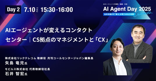 コンタクトセンター向けCXソリューションを開発・提供するモビルス株式会社(本社:東京都港区、代表取締役社長:石井智宏、以下:モビルス)は、一般社団法人AICX(AI Customer Experience)協会が2025年7月9日(水)~11日(金)に開催するカンファレンス「AI Agent Day 2025 Summer」にて、代表 石井智宏が登壇することをお知らせします。