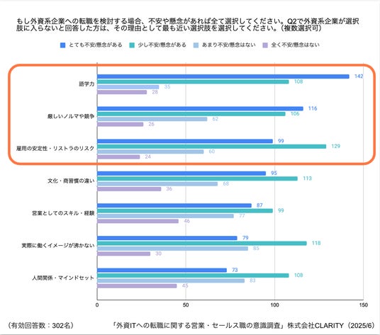 外資系転職の不安・懸念は「語学力」が最多、「厳しいノルマや競争」「雇用の安定性・リストラのリスク」も