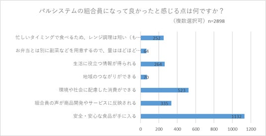 調査では、パルシステムに加入してよかったことも聞きました。「安全・安心な食材が手に入る」との回答が最も多く、次いで「環境や社会に配慮した消費ができる」との結果になりました。自由回答では「玄関先まで商品を届けてくれるので助かっています」「買い物に行かずに済むので、子どもと遊ぶ時間をたくさんとれる」など、宅配サービスへのコメントが多くありました。「自然災害にあった地域の生産者の状況などが分かり、募金や購入で微力ながら協力できる」「手頃な値段で有機の食材が手に入る」などの感想がありました。