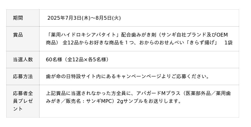 この「歯が命の日」を記念して、サンギ開発のむし歯予防成分「薬用ハイドロキシアパタイト」配合の歯みがき剤が60名様に当たるプレゼントキャンペーンを2025年7月3日(木)~8月5日(火)にて実施いたします。