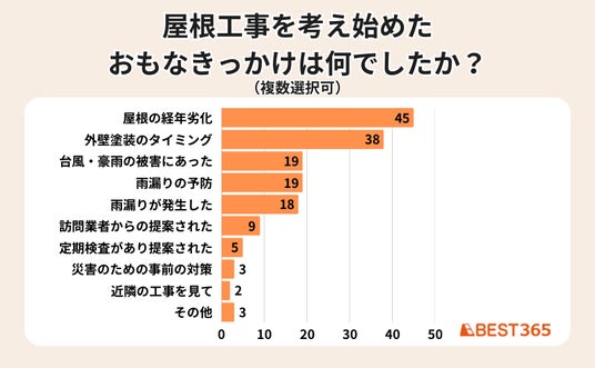 工事を実施したきっかけで最も多かったのは、「屋根の経年劣化」と「外壁塗装のタイミング」という“予防的なメンテナンス”によるものでした。実際に「台風・豪雨被害」や「雨漏りの発生」といったトラブルを契機に修理を行った人は18~19人にとどまり、事前にメンテナンスとして工事をした人が多数派という結果になりました。