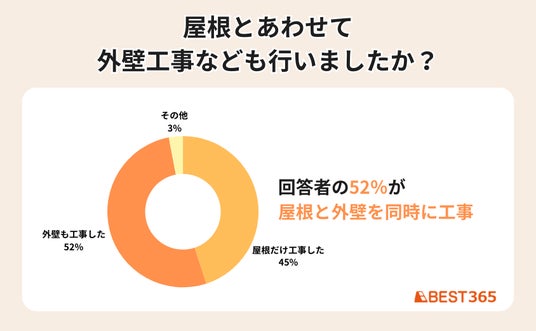 アンケートでは、52%の方が「屋根と外壁を同時に工事した」と回答しています。結果から、外壁塗装の際に屋根の状態も確認し、同時に工事をするケースが多いことがわかります。