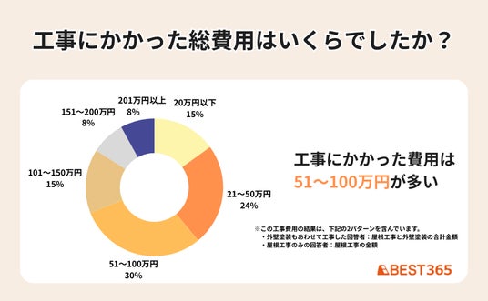 工事にかかった費用については「51~100万円」と回答した人が最も多く、全体の30%を占めました。次いで「21~50万円」が24%、「20万円以下」が15%となっており、全体の69%が100万円以下で工事を終えています。