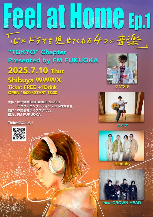 FM FUKUOKA発、個性派4バンド集合。同局でパーソナリティをつとめるirienchy、ニイナに加え、ソロプロジェクトとなったウソツキ、デビュー間もないながら話題沸騰のCROWN HEADが競演。