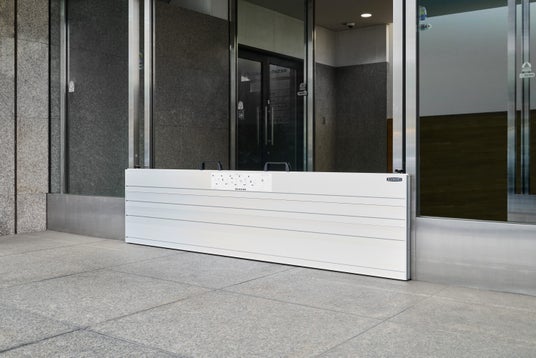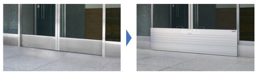 簡易脱着式防水板「オクタッチ」は、左右レールの設置が不要の為、エントランスのデザインはそのままに、施工なしで導入が可能。セット操作も簡単で、緊急時の迅速な防水対策を可能にした高性能な防水板です。