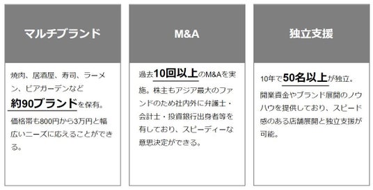 今回のM&Aによりグループ店舗数240店舗(直営123店・FC13店・業務委託93店・転貸11店)、業態は96業態に