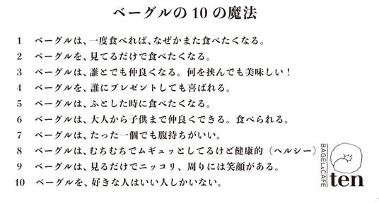 本場アメリカで味わった感動と魔法をもっと多くのお客様に楽しんでいただきたい。そんな思いで『BAGEL&CAFE ten』という小さなお店を作りました。ベーグルには不思議な魔法が10個あります。