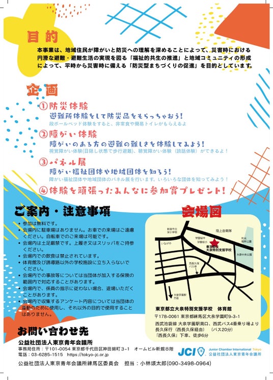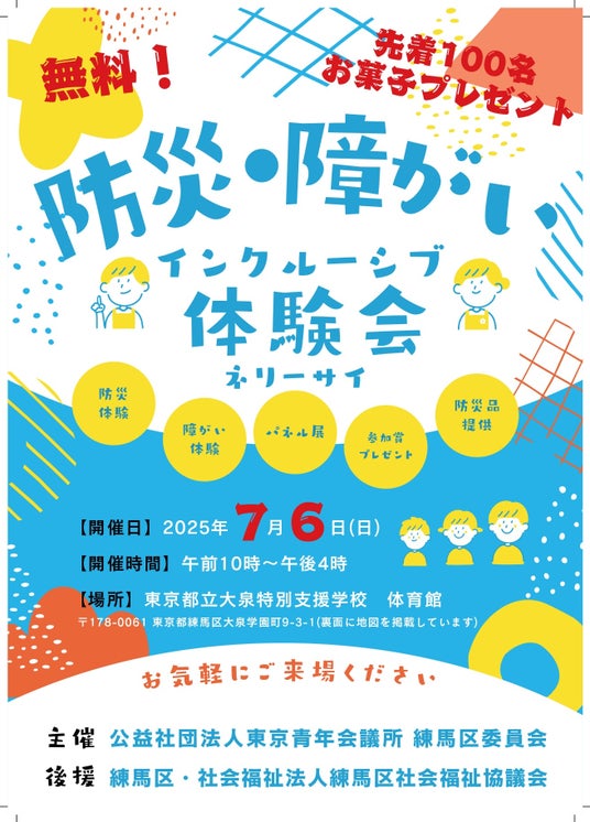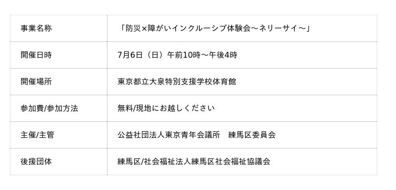 公益社団法人東京青年会議所 練馬区委員会は、2025年7月6日(日)に「防災×障がいインクルーシブ体験会(ネリーサイ)」を東京都立大泉特別支援学校にて開催します。本イベントは、地域住民が防災への備えと障がいへの理解を深め、災害時における共生の重要性を体験的に学べる内容となっています。視覚・聴覚障がいの体験、防災用品の使い方講習、福祉団体によるパネル展示など、多彩なプログラムを通して「もしも」の時に備える力と支え合う心を育みます。参加費は無料、先着100名にはお菓子のプレゼントもあり、子どもから大人までどなたでもお気軽にご参加いただけます。