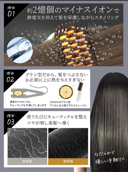 1.マイナスイオンテクノロジー約2億個のマイナスイオンが静電気から髪を保護。使うたびにキューティクルを整え、髪に潤いと輝きを与え、滑らかな質感のある艶髪を実現。乾燥による髪のパサつきやダメージを抑えながら、美しい髪作りをサポート。