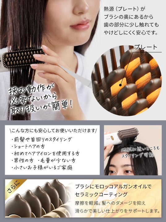 2.先進のセラミックグレースコーティング技術先進のセラミックグレースコーティングに、モロッコアルガンオイルを内包した独自プレード構造が、ブラッシング時の髪の摩擦を抑え、熱を髪にやさしく届けながら潤いをキープ。使うたびに輝きが増し、7日後には驚くほどなめらかな艶髪へ。