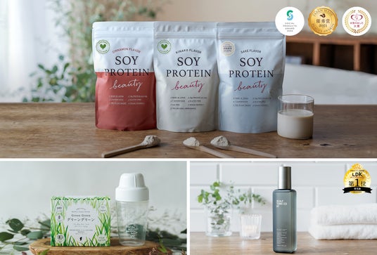 上:大人気の大豆プロテイン、ソイプロビューティ。下左:オーガニック大麦若葉のグリーングリーン。下右:ジェンダーレスで人気のヘアケア商品 FeelFreedomスカルプトニックME07(医薬部外品)<育毛剤>