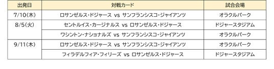 LOTTE JTBが提供するMLB(TM)観戦ツアーには、以下の日程と特徴があります:日程