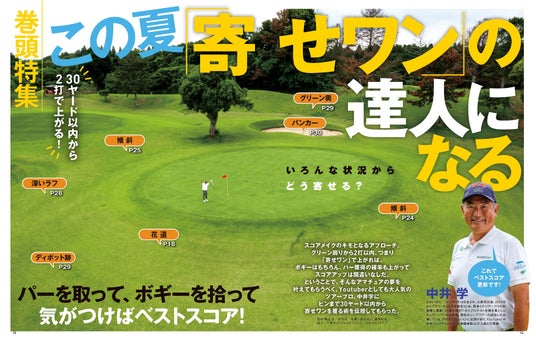 巻頭特集は「寄せワンの達人になる!」。もし、グリーンを狙ったショットが外れてしまっても、次のショットでピンの近くに寄せてワンパットで決められれば、スコアはまとまるし大崩れもしなくなる。「花道」、「ラフ」、「傾斜」に「バンカー」など、いろんな状況から1ピン以内に寄せられるテクニックとアプローチの基本を中井学がレッスン。